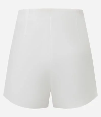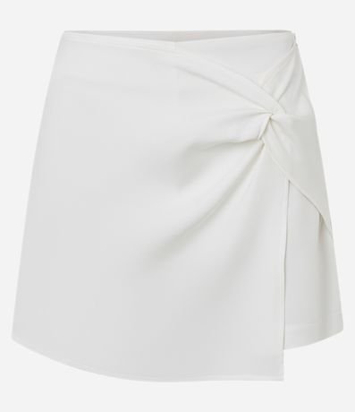 Short saia feminino em alfaiataria com nó sobreposto frontal.