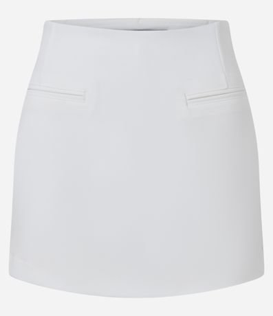 Short saia em crepe com cintura fixa e bolsinhos frontais.