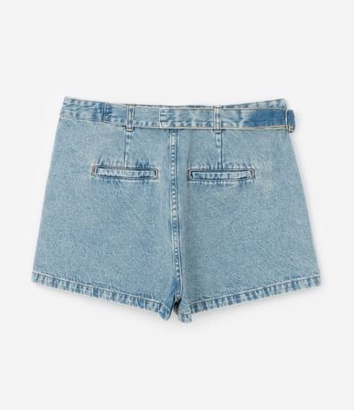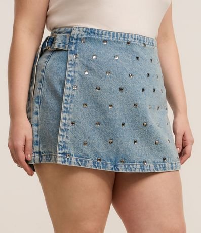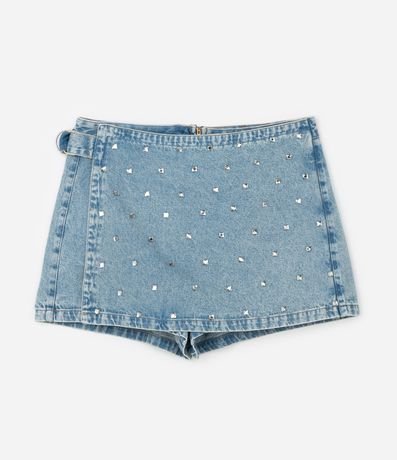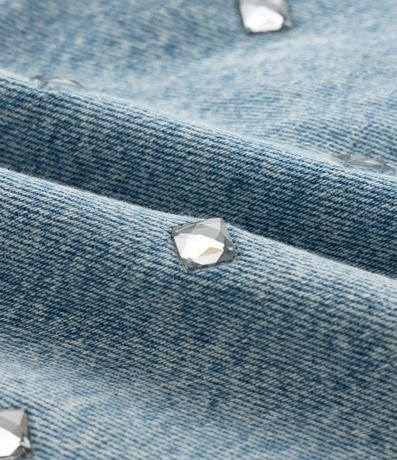 Ref: Short saia confeccionado em jeans composto por algodão BCI. A peça tem camada frontal com brilhinhos fixados.