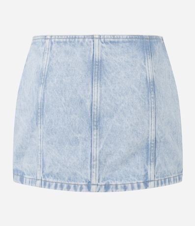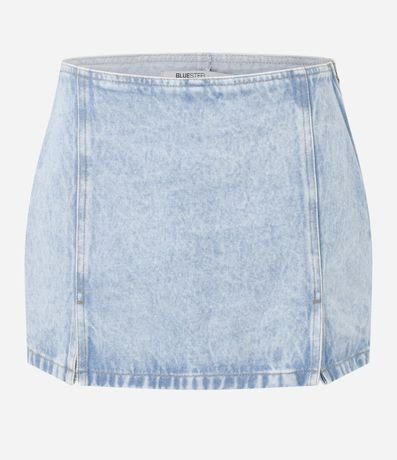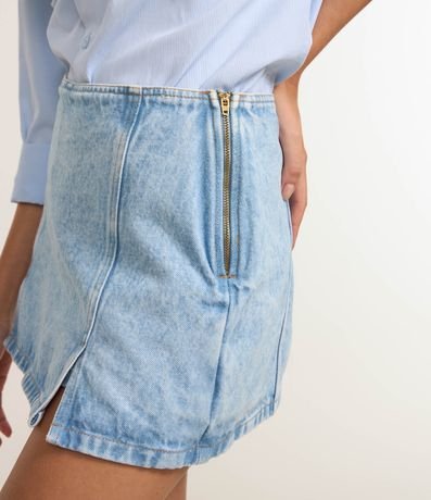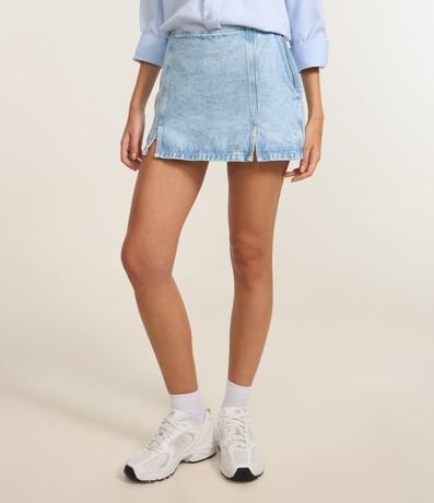 Ref: Short saia curto confeccionado em jeans de algodão certificado. A peça tem recortes verticais e fendinhas na barra.