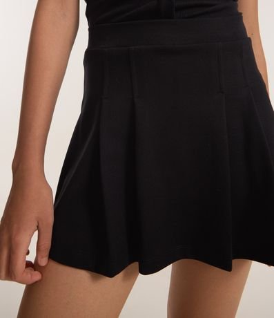 Short saia feminino confeccionado em ponto roma, com cintura alta e preguinhas.
