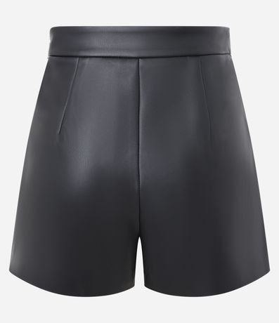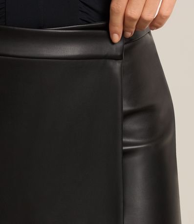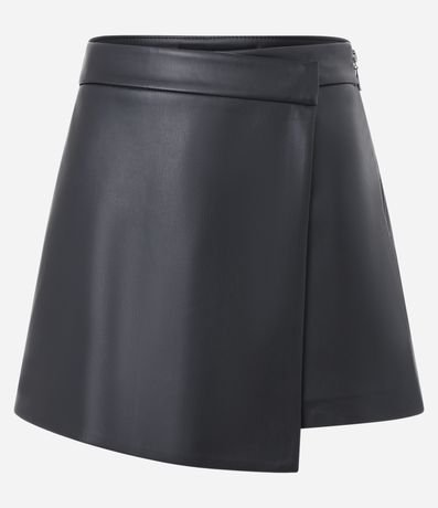 Short saia curto confeccionado em material sintético, transpasse frontal assimétrico e com fechamento por zíper lateral.
