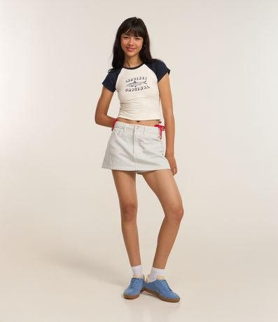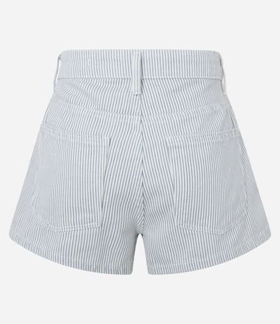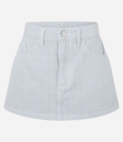 Ref: Short saia confeccionado em sarja de algodão BCI. A peça tem bolsos frontais e traseiros, passantes no cós e estampa listrada.