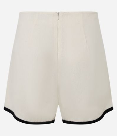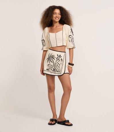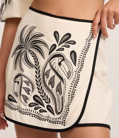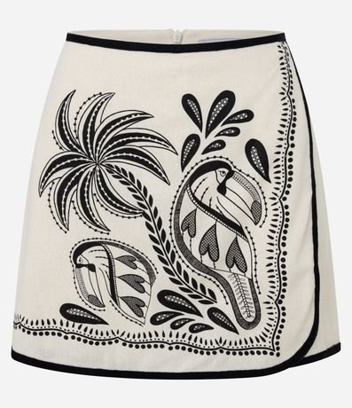 Ref: Short saia feminino confeccionado em viscolinho mais sustentável. Possui cós fixo, com fechamento por zíper, viés contrastante e estampa tropical.