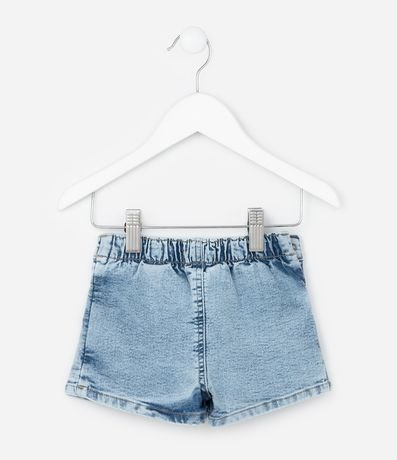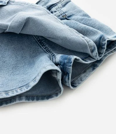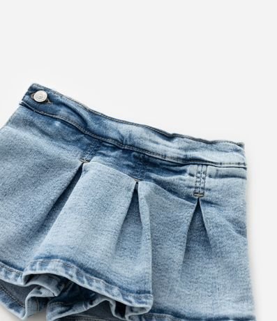 Ref: Short saia infantil confeccionado em jeans mais sustentável através de boas práticas ambientais. Possui cós com elástico, fechamento lateral, por botão e pregas.