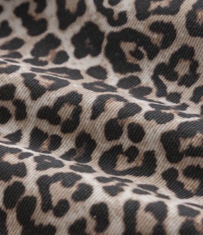 Short saia infantil confeccionado em sarja, com bolsinhos traseiros e estampa de oncinha.