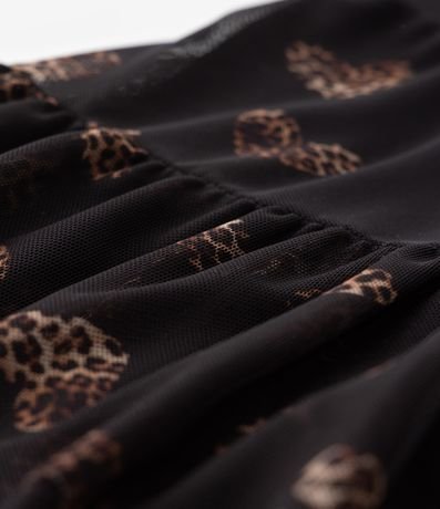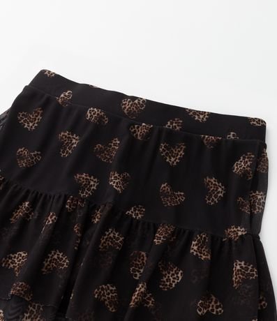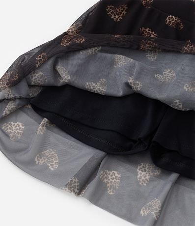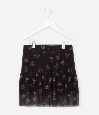 Short saia infantil confeccionado em tule, com cós elástico, babadinhos e estampa de corações em oncinha.