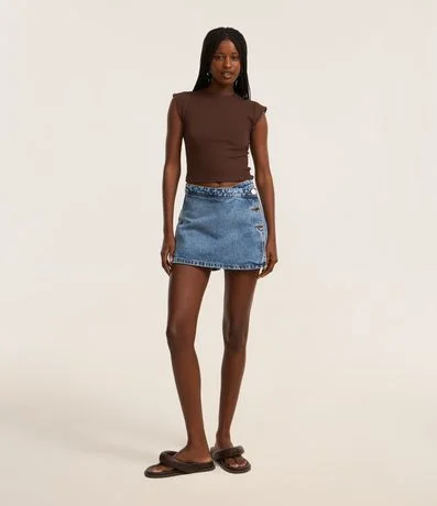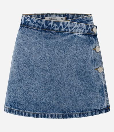 Ref: Short saia feminino confeccionado em jeans de material mais sustentável. Possui transpasse frontal, fechamento por botões e bolsos.
