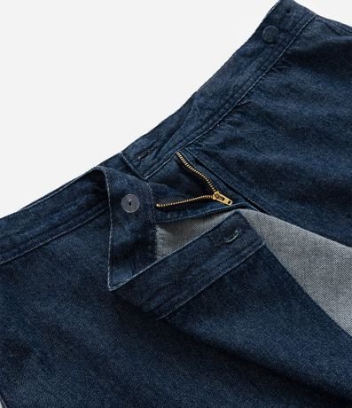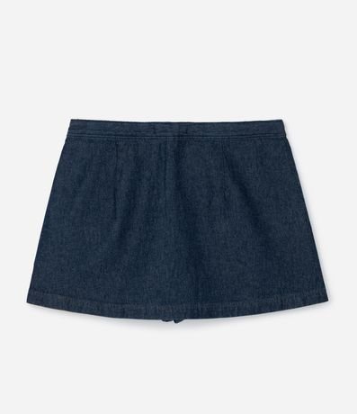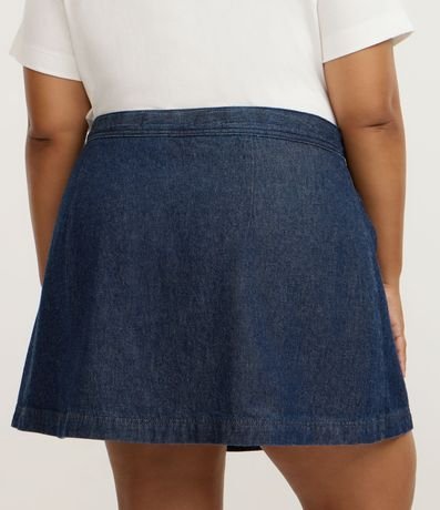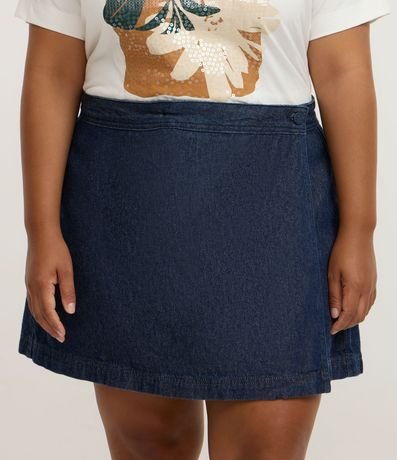 Ref: Short saia plus size, confeccionado em jeans, sem estampa e com frente transpassada.