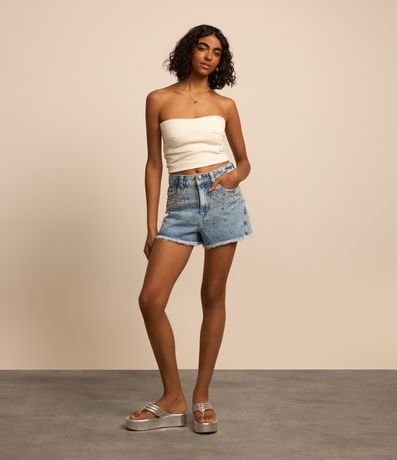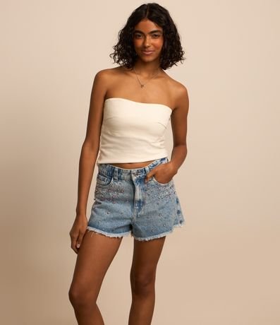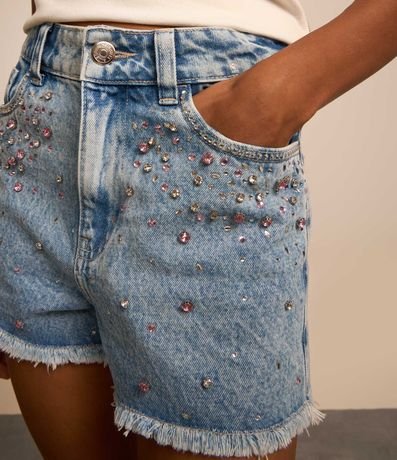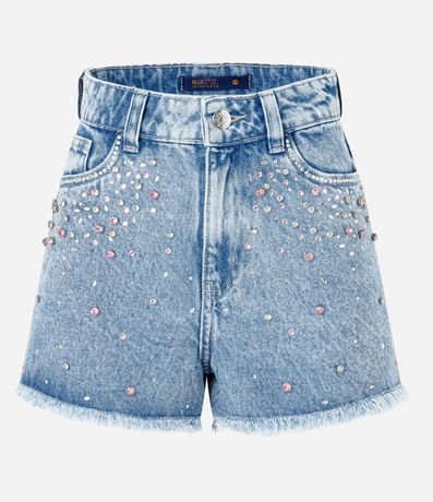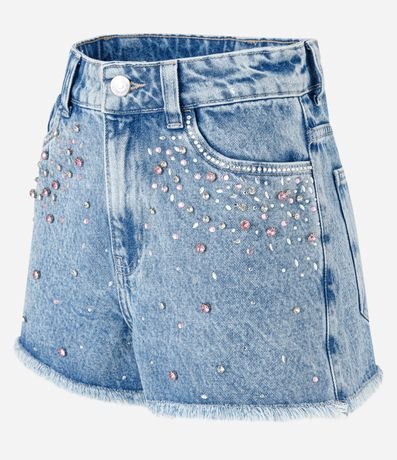 Short Slim Cintura Alta em Jeans com Pedrinhas Aplicadas