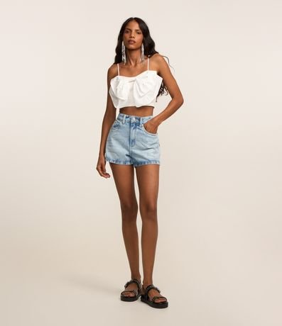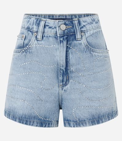 Ref: Short slim, curto, confeccionado em jeans com bolsos frente e costas, passantes no cós e ondinhas com brilhos aplicados.