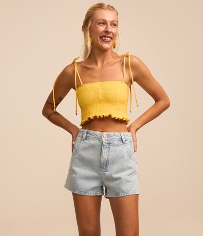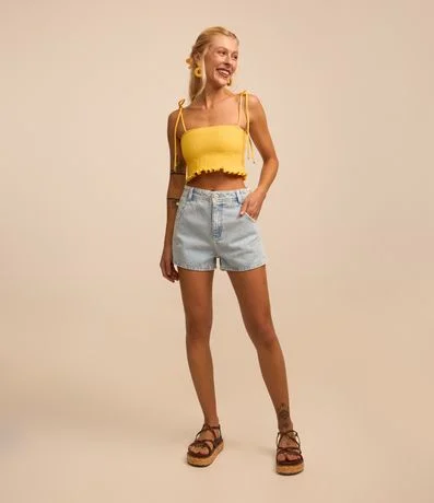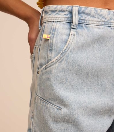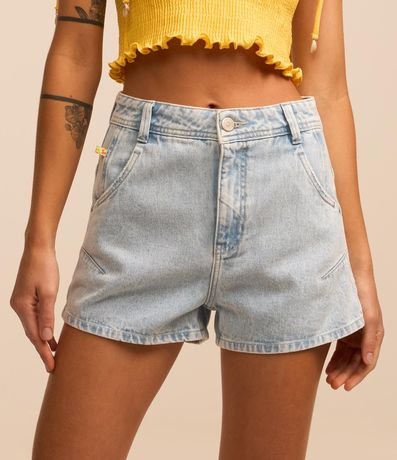 Ref: Short slim confeccionado em jeans, detalhes em pences, bolsos e etiqueta na lateral do bolso.