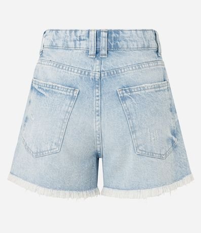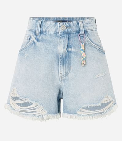 Ref: Short slim, confeccionado em jeans com puídos, bolsos, puídos frontais, barra desfeita e chaveiro com mosquetão.