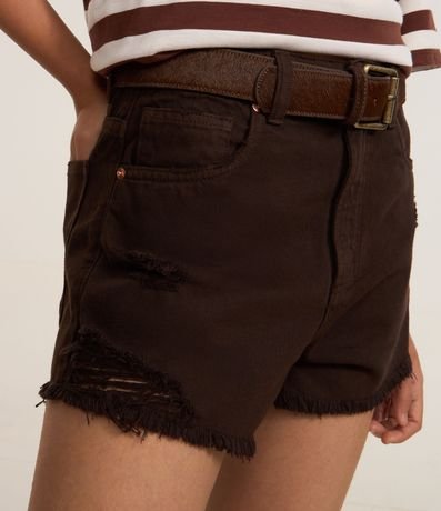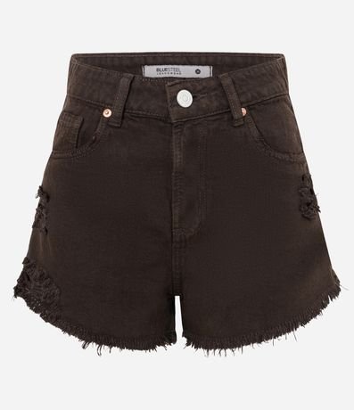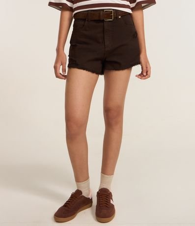 Short feminino confeccionado em sarja, de modelo slim, com passantes no cós e bolsos. Sem estampa, possui fechamento frontal com botão e zíper e barra desfiada.