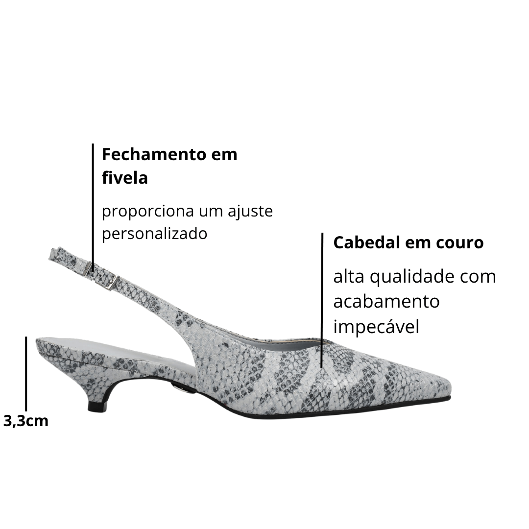 Salto: fino baixo de 3,3 cm, perfeito para quem busca conforto sem abrir mão do charme.
