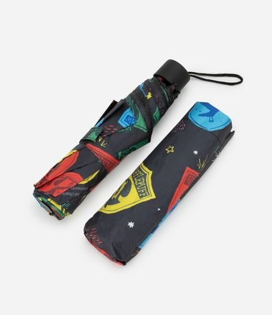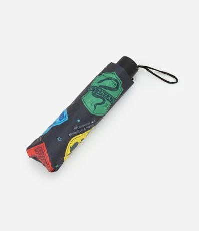 Sombrinha dobrável confeccionada em poliéster, com estampa do Harry Potter e acompanha saquinho para guardar.