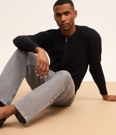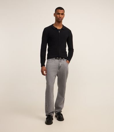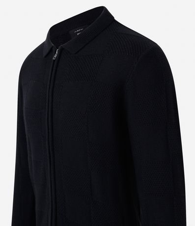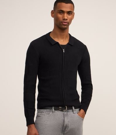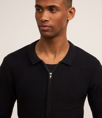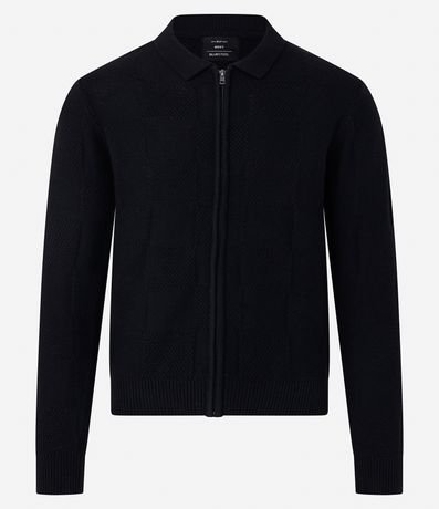 Suéter aberto confeccionado em algodão mais sustentável, gola colarinho, fechamento por zíper. Peça no modelo boxy com textura xadrez, manga longa ajustada e barra ajustada.