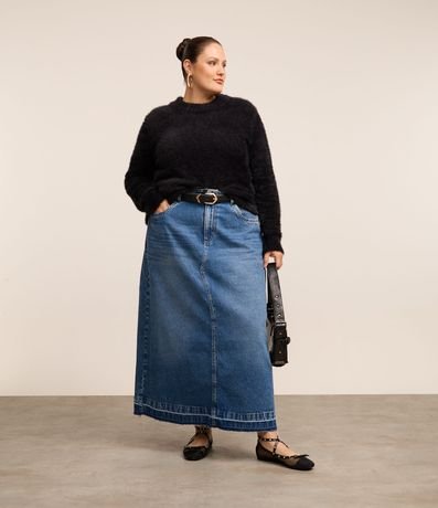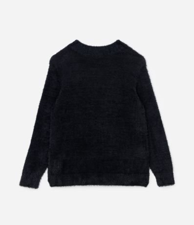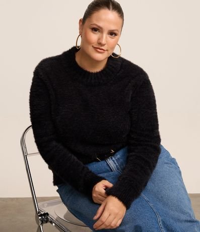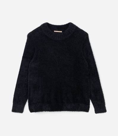 Ref: Blusa de frio alongada de tricô. Suéter com gola redonda, mangas longas e textura de pelinhos.