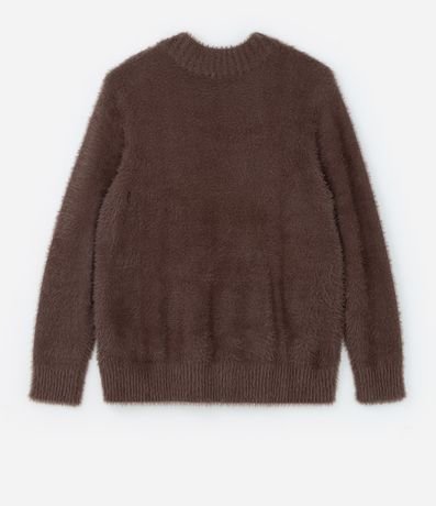 Blusa de frio alongada de tricô. Suéter com gola redonda, mangas longas e textura de pelinhos.