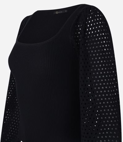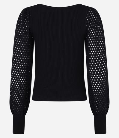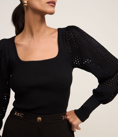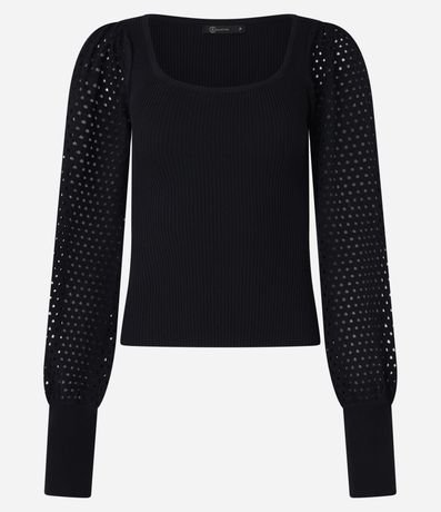 Suéter Canelado em Tricô com Furos na Manga Bufante