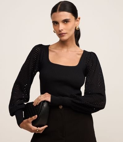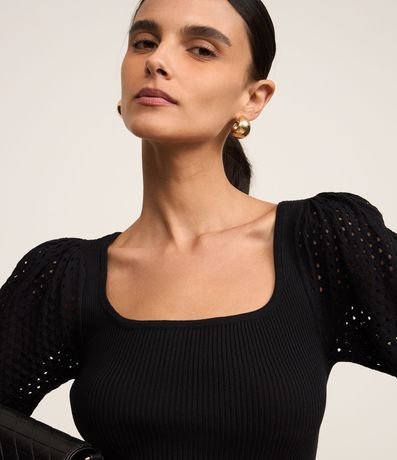 Suéter e mangas bufantes com furos, confeccionada em tricô leve com viscose mais sustentável, com decote quadrado. Corpo da peça com textura toda canelada.