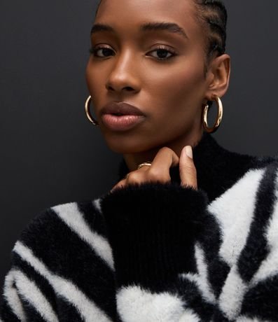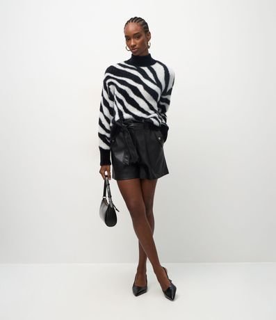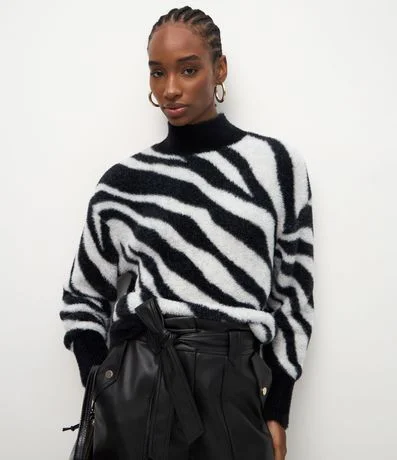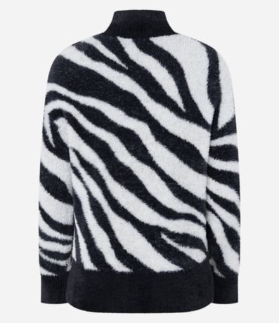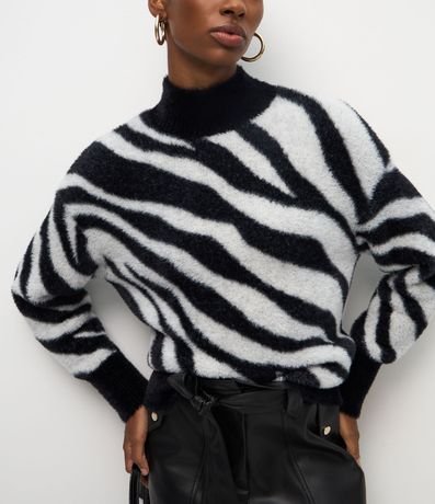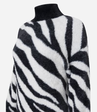 Ref: Suéter feminino em pelo artificial com estampa animal print imitando zebra. Possui gola alta, mangas longas estruturadas que reforça a modelagem e o contraste entre as superfícies.