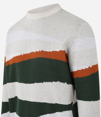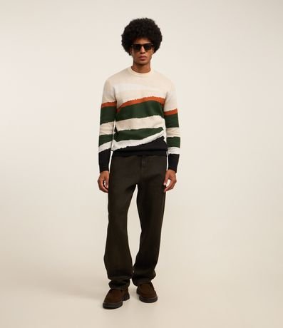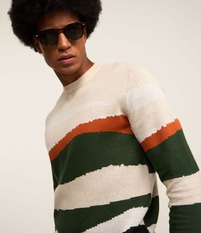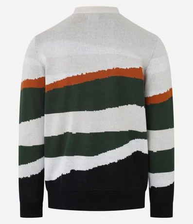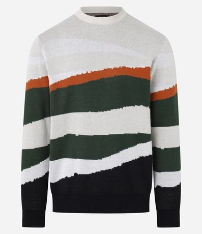 Suéter masculino confeccionado em algodão mais sustentável, gola redonda, manga longa e estampa em bloco de cores contrastante.