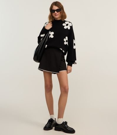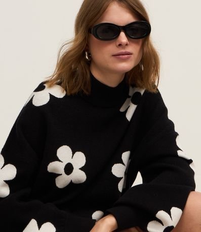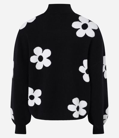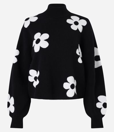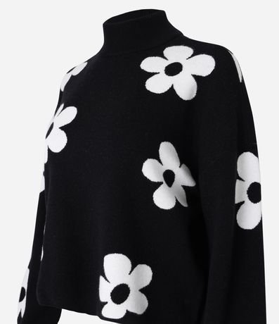 Ref: Suéter regular em jacquard com golinha alta e estampa em repetição de margaridas.