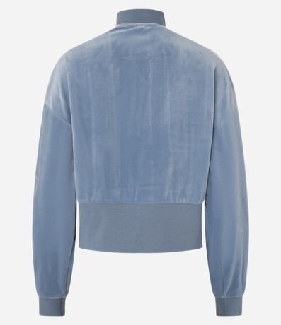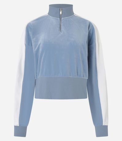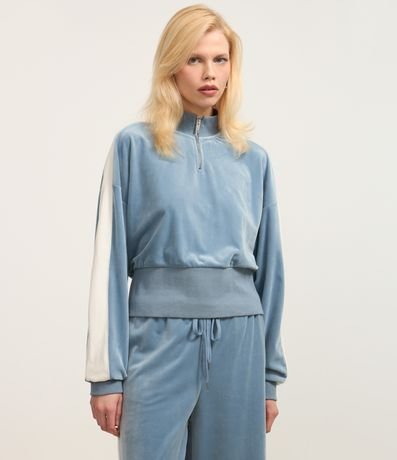 Suéter feminino, confeccionado em moletom felpudo, com golinha alta, zíper, mangas longas e detalhes ajustados nos punhos e barra.