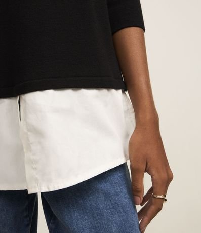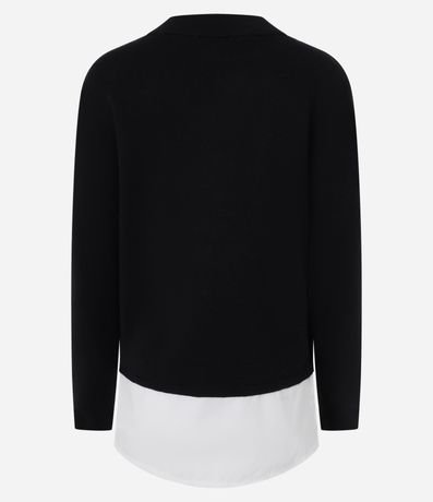 Ref: Suéter confeccionado em tricô pesado com 50% de viscose mais sustentável. Possui mangas longas e gola redonda. Uma barra sobreposta na barra que traz um aspecto de camisa para fora da peça, é o diferencial de estilo deste suéter.