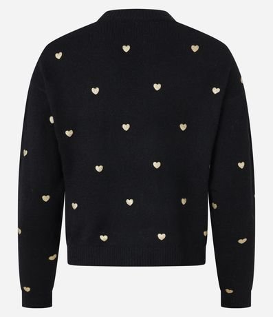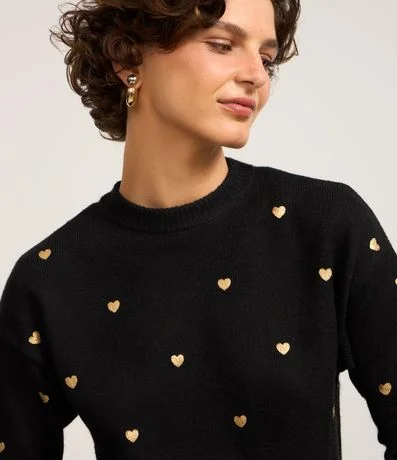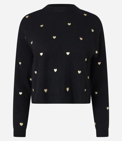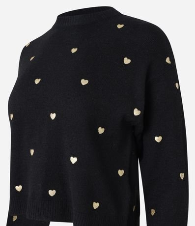 Ref: Suéter curto, confeccionado em tricô leve, cava deslocada e com estampa em repetição de mini corações.
