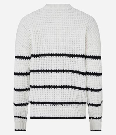 Suéter de mangas longas com cavas deslocadas, confeccionado em tricô pesado de acrílico, com gola redonda. Esta blusa de frio dispõe com listras horizontais.