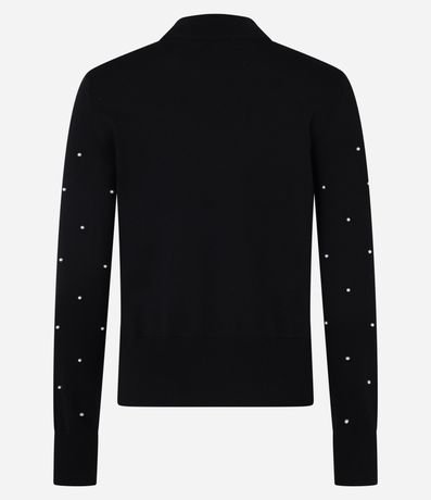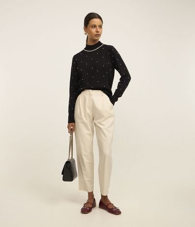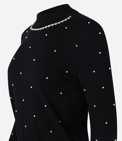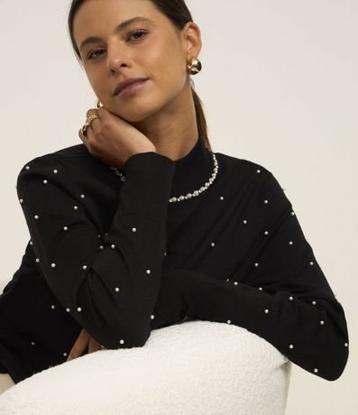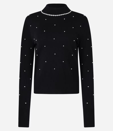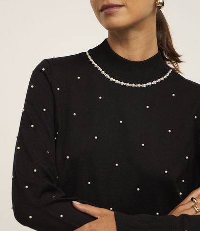Ref: Suéter de tricô pesado confeccionado com viscose mais responsável. A blusa de frio tem mangas longas, gola alta, aplicação de pérolas artificiais na parte frontal e mangas e aplicação de pérolas e strass na gola, emulando um colar.