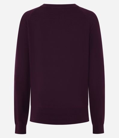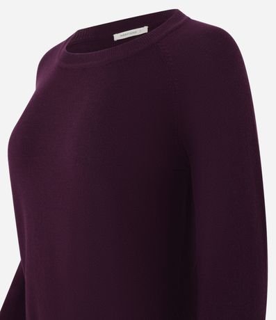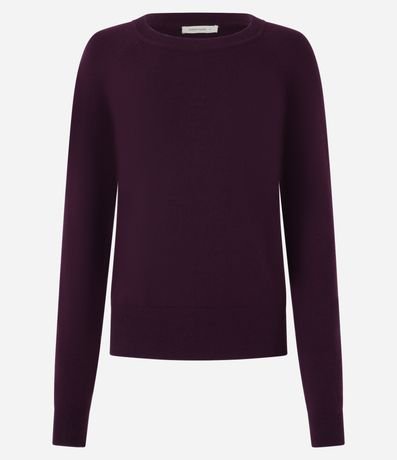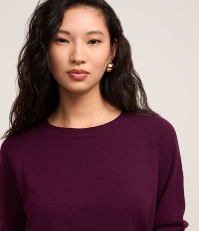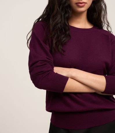 Suéter feminino, confeccionado em tricô, com gola redonda, mangas longas e superfície sem estampa.