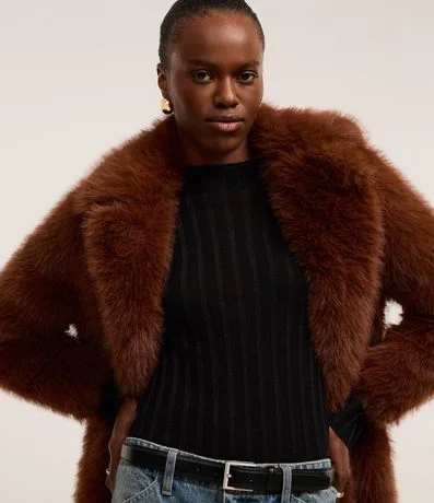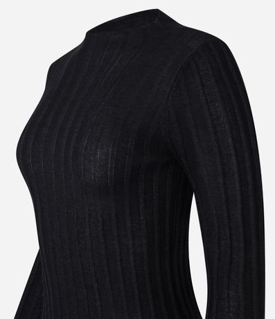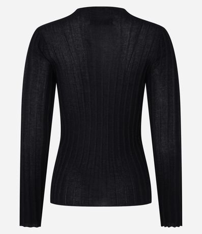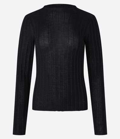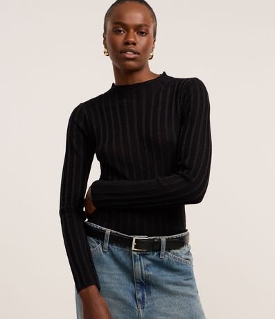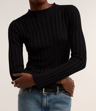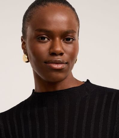 Ref: Suéter confeccionado em tricô com viscose mais sustentável, com gola redonda e mangas longas. Peça tem listras verticais texturizadas, além de tecido com fios metalizados.