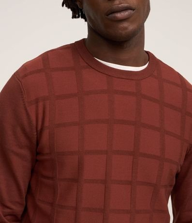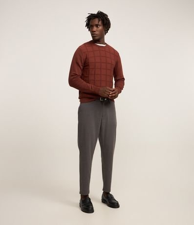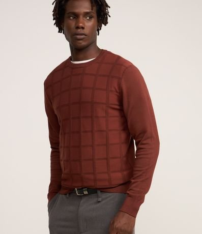 Ref: Suéter masculino em tricô, confeccionado em viscose mais sustentável, com gola redonda, mangas longas, textura quadriculada e detalhes canelados.