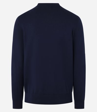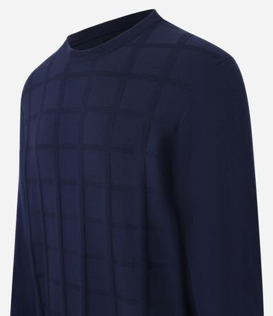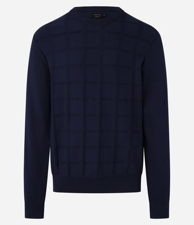 Ref: Suéter masculino em tricô, confeccionado em viscose mais sustentável, com gola redonda, mangas longas, textura quadriculada e detalhes canelados.