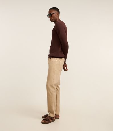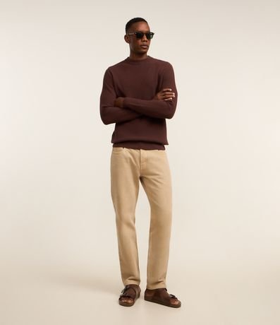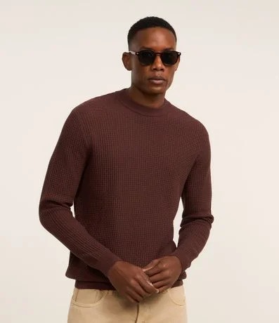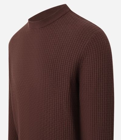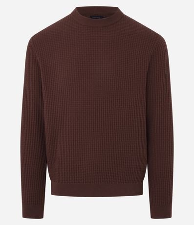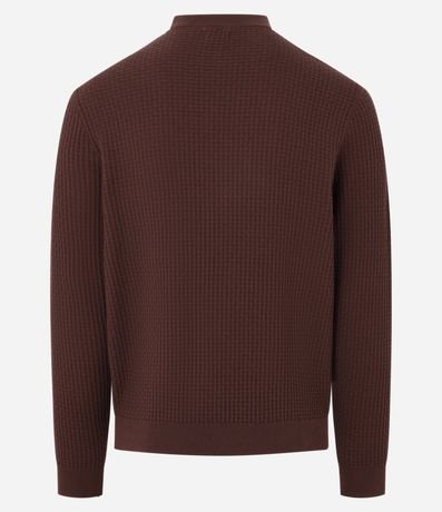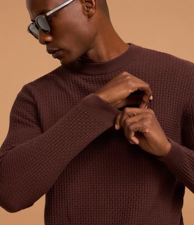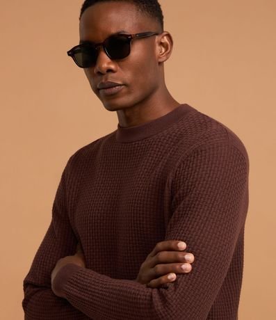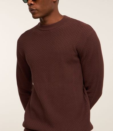 Suéter masculino confeccionado em malha tricô, com gola redonda e sem estampa. Possui textura quadriculada.