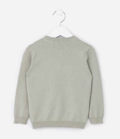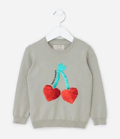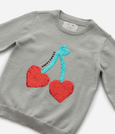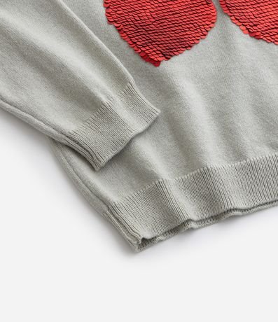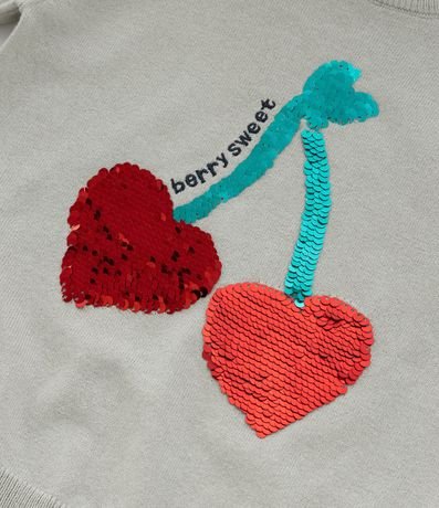 Ref: Suéter infantil confeccionado em tricô, com gola redonda, mangas longas e bordado em paetês de cerejas em formato de coração.
