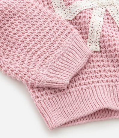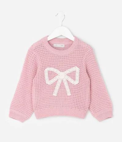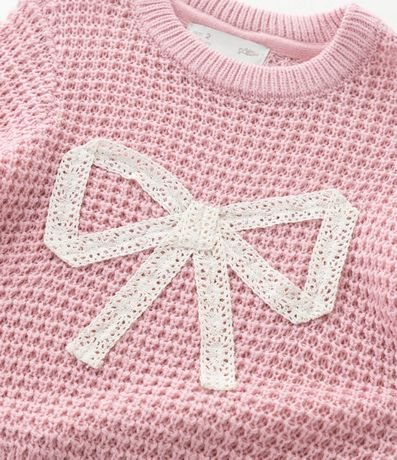 Suéter infantil confeccionado em efeito tricô de acrílico com toque macio e aquecimento leve. Possui gola redonda, mangas longas e acabamento canelado na barra e nos punhos. Traz laço aplicado em destaque na parte frontal, garantindo visual delicado.