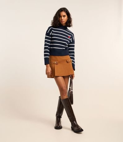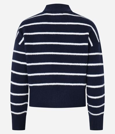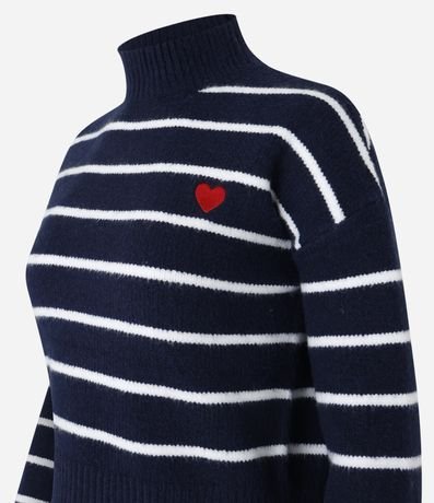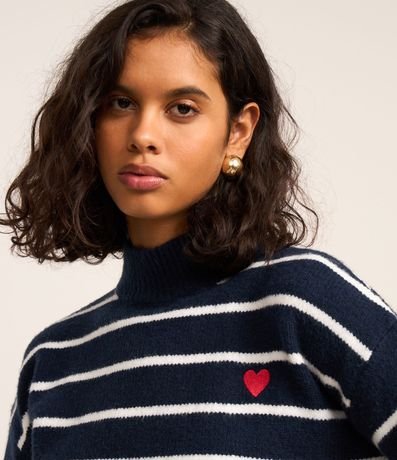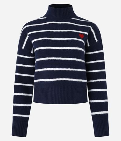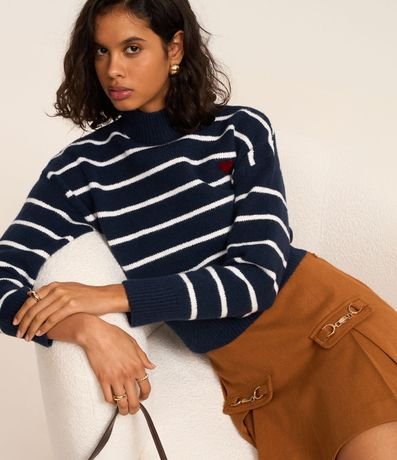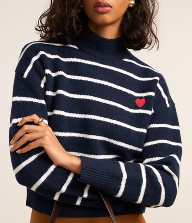 Ref: Suéter quentinho confeccionado em tricô pesado, com gola alta, cava deslocada e padronagem de listras. Possui punhos, gola e barra canelados, e detalhe de coração bordado no peito.