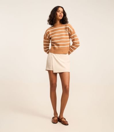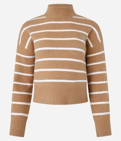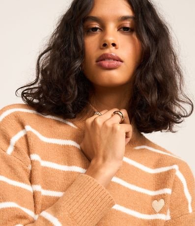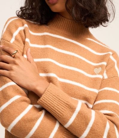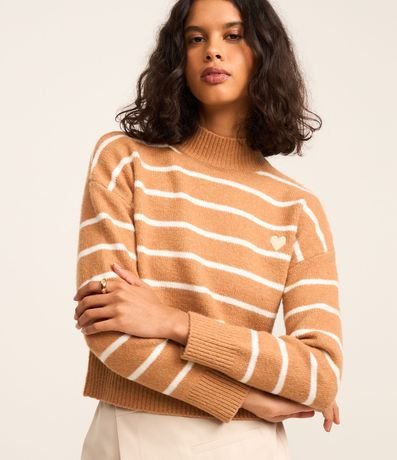 Ref: Suéter quentinho confeccionado em tricô pesado, com gola alta, cava deslocada e padronagem de listras. Possui punhos, gola e barra canelados, e detalhe de coração bordado no peito.