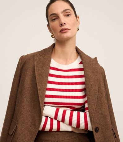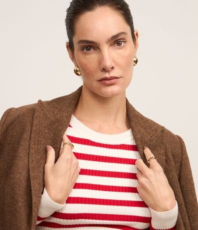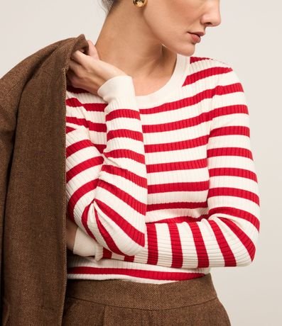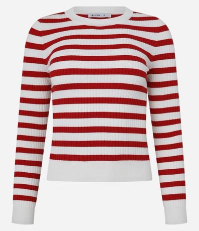 Ref: Suéter feminino confeccionado em tricô, com viscose sustentável em sua composição, gola redonda e padronagem de listras.