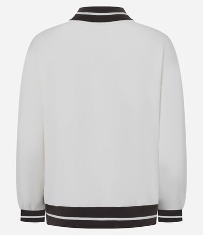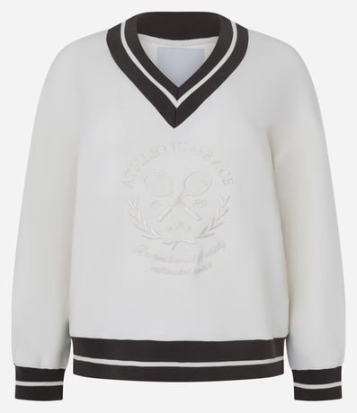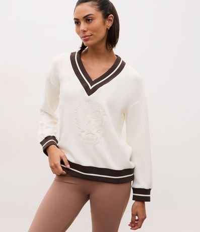 Ref: Suéter oversized, esportivo com lettering e raquetes bordadas na parte da frente e listra na gola, punhos e barra.