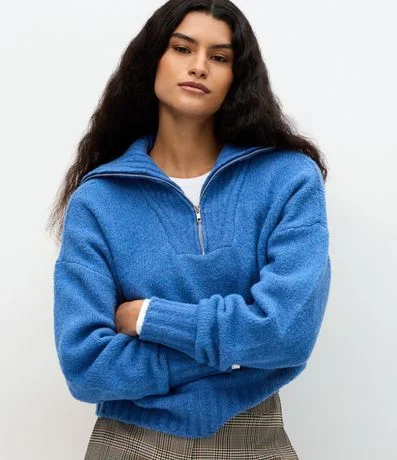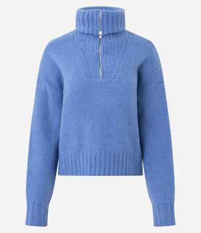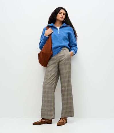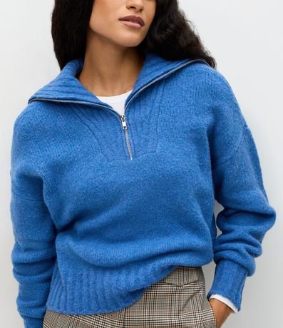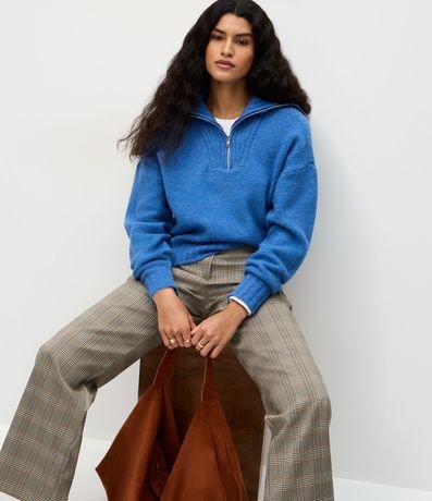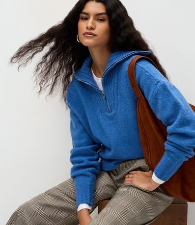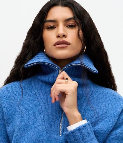 Suéter feminino em tricô, com gola alta estruturada e fechamento em zíper metálico frontal. Possui textura discreta em linhas verticais, modelagem regular, mangas longas e barra canelada.