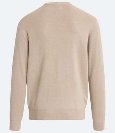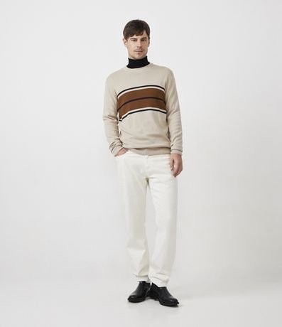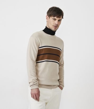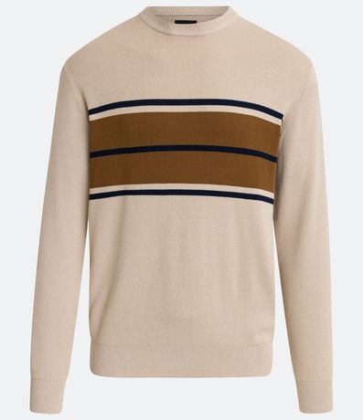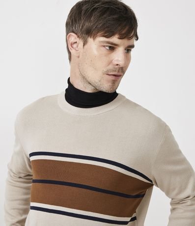 Suéter masculino, modelo regular, confeccionado em tricô, com mangas longas, punhos ajustados e estampa de listras contrastantes.