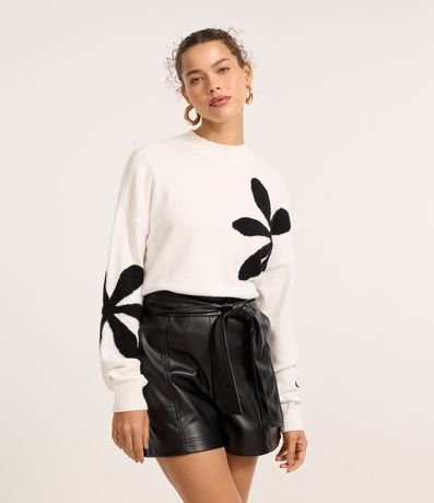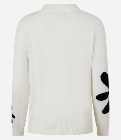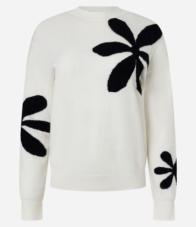Ref: Suéter feminino confeccionado em tricô pesado, de modelo regular, com gola redonda e padronagem jacquard floral. Possui gola, barra e punhos com textura canelada.