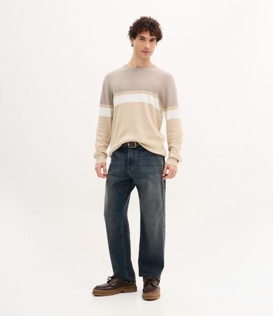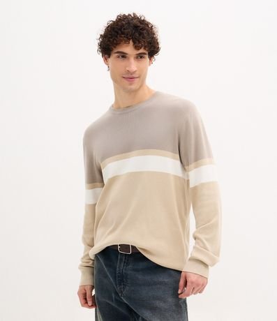Ref: Suéter masculino confeccionado em viscose mais sustentável com gola redonda, manga longa. Peça regular com padronagem de bloco de cores.
