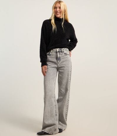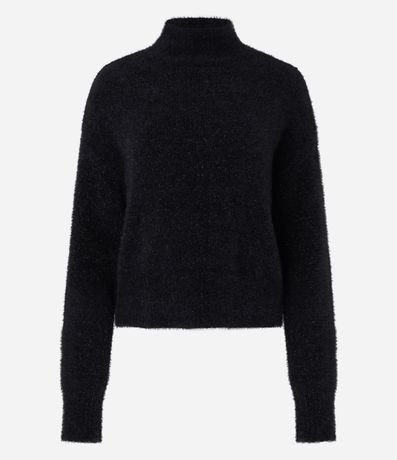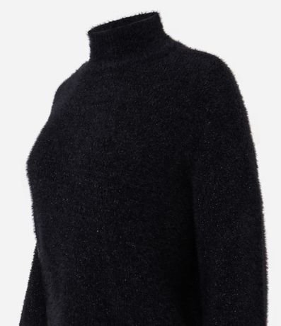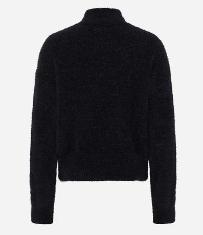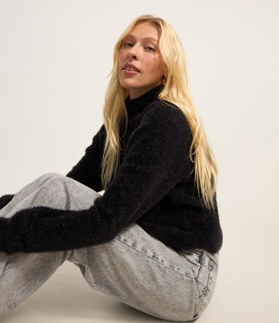 Suéter slim de comprimento mais curto, confeccionado em tricô, com golinha alta e manas longas. Esta blusa de frio tem fios metalizados