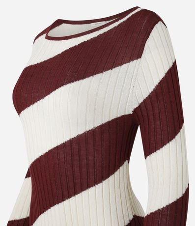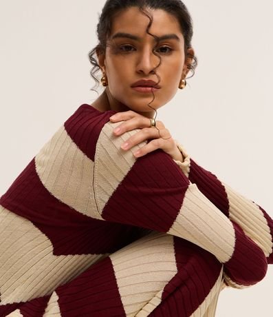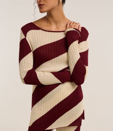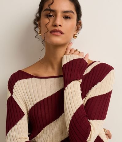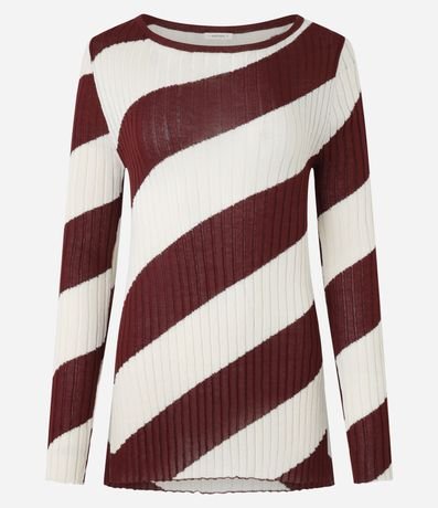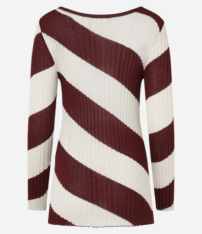 Ref: Suéter slim, confeccionado em tricô com caimento leve, com decote canoa, mangas longas, texturas que foram sulcos verticais e listras largas em efeito espiral. Este produto possui viscose certificada em sua composição, sendo ambientalmente mais responsável.
